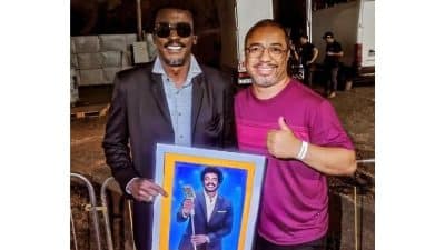 Artista são-carlense entrega quadro em 3D a Seu Jorge durante a Tusca 2025