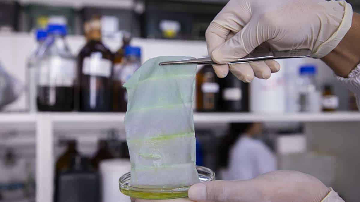 Oliveira Filho diz que a produção da manta de nanofibras e inicia com uma solução polimérica, obtida pela mistura e agitação da policaprolactona, extrato de repolho e do ácido acético. Em seguida, essa solução é introduzida no equipamento de SBS, que é composto por uma fonte de gás comprimido, um regulador de pressão para controlar o fluxo de gás, uma bomba de injeção que direciona a solução para a matriz de fiação com bico, e um coletor com velocidade de rotação ajustável, onde as nanofibras são depositadas para formar a manta. O processo final resulta em fibras em escala nanométrica, similares a fibras de algodão.