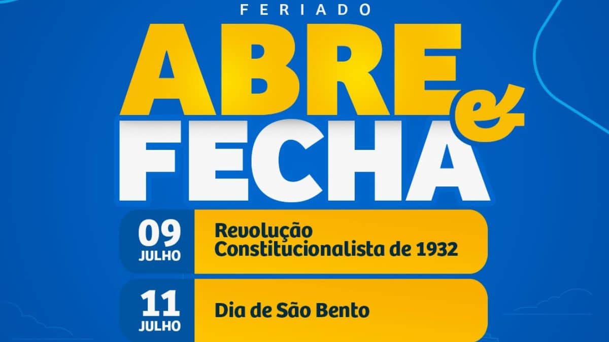 A Prefeitura de Araraquara fecha nesta quarta-feira (9), no feriado da Revolução Constitucionalista, e retoma o atendimento na próxima segunda-feira (14). Vale lembrar que sexta-feira (11) é feriado municipal devido à comemoração do padroeiro da cidade, São Bento, e quinta-feira (10) será ponto facultativo para os servidores municipais.