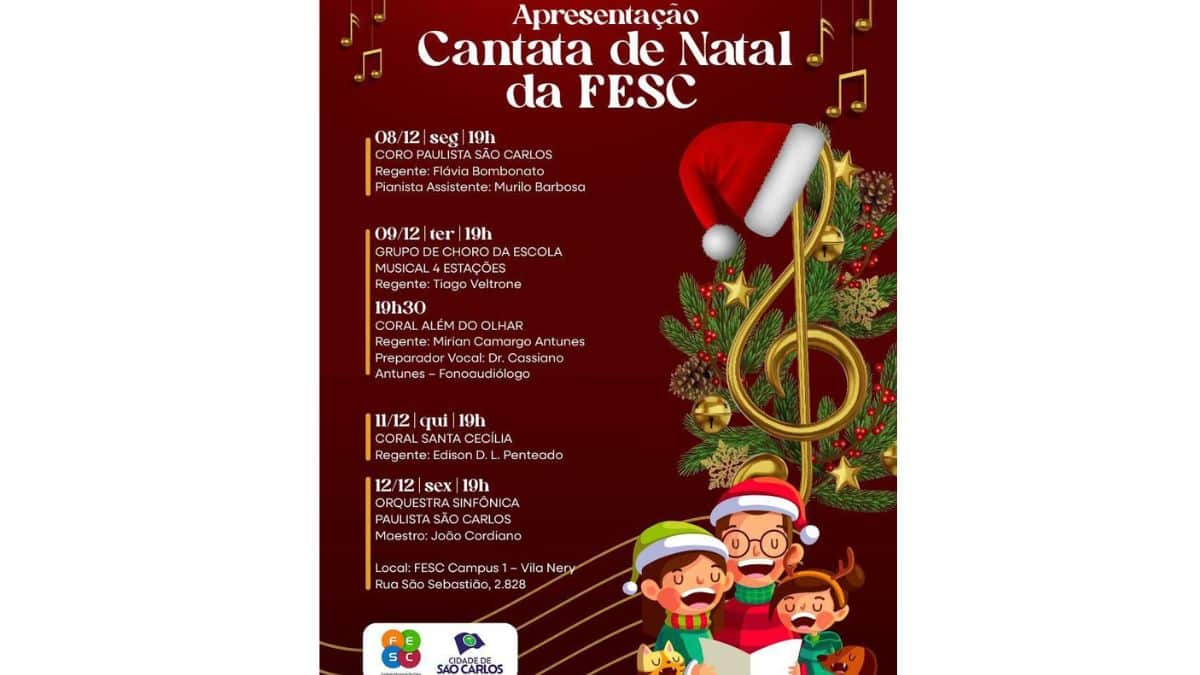 A Fundação Educacional São Carlos – Fesc realizará, entre 8 e 12 de dezembro, a Cantata de Natal, um evento especial que reúne apresentações musicais de grupos e corais parceiros que utilizam os espaços da instituição ao longo do ano para a realização de seus ensaios. A iniciativa tem como objetivo valorizar essas parcerias, apresentar à comunidade a finalidade social e cultural desses usos e celebrar o espírito natalino por meio da música.