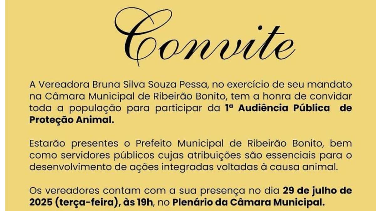 Por meio de uma iniciativa da vereadora, a Câmara Municipal de Ribeirão Bonito realizará a sua primeira audiência pública sobre a causa animal, que ocorrerá nesta terça-feira, 29, às 19h, na Câmara Municipal, e contará com a presença dos vereadores da cidade e da região, dos membros do Poder Executivo e palestrantes que abordarão o tema. A parlamentar destaca que a referida audiência pública será dedicada à memória dos inúmeros animais que perderam suas vidas, vítimas da crueldade humana, e espera que seja um passo construtivo em busca de um futuro melhor para a causa animal no município.