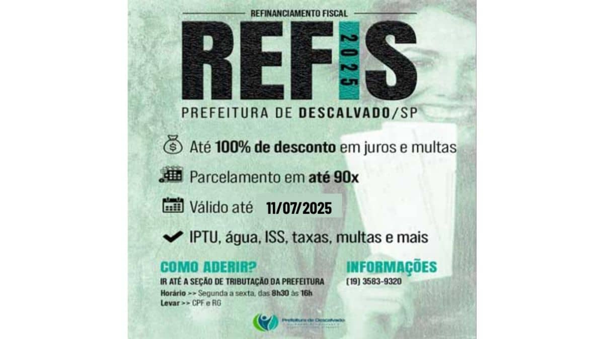 A Prefeitura de Descalvado (SP) prorrogou o prazo para adesão ao Programa de Refinanciamento Fiscal (Refis) até a próxima sexta-feira, dia 11 de julho. A iniciativa permite que moradores e empresas inadimplentes renegociem suas dívidas com o município, oferecendo condições facilitadas de parcelamento e descontos atrativos.