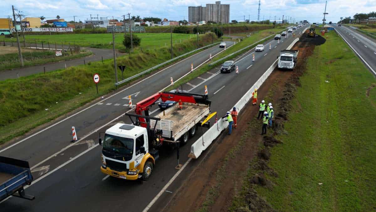 A terceira faixa de rolamento está sendo construída no canteiro central da SP-310. Durante a execução dos serviços, a pista da esquerda permanece interditada em ambos os sentidos da rodovia.