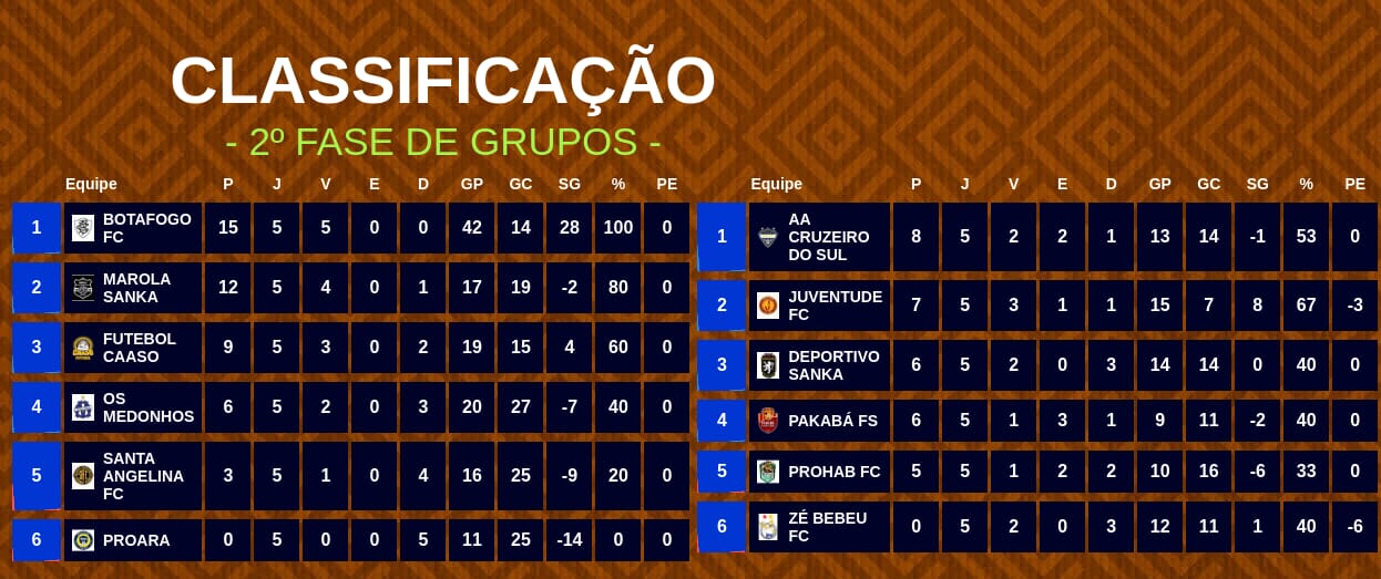 Com o fim da segunda fase, estão classificadas para as quartas de final: Botafogo FC, Pakabá FS, Marola Sanka, Deportivo Sanka, Juventude FC, Futebol Caaso, AA Cruzeiro do Sul e Os Medonhos.