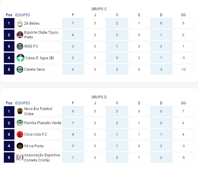 No Grupo D, Nova Era mantém liderança com impressionantes 9 pontos, enquanto Planalto Verde, com 7, também já assegura a vaga na segunda fase. Mas a briga continua acirrada: Coca Cola, com 4 pontos, Pé Na Porta, com 3, e Cometa Cristão, com 1, lutam por duas vagas restantes, prometendo confrontos de tirar o fôlego e jogadas de puro talento.