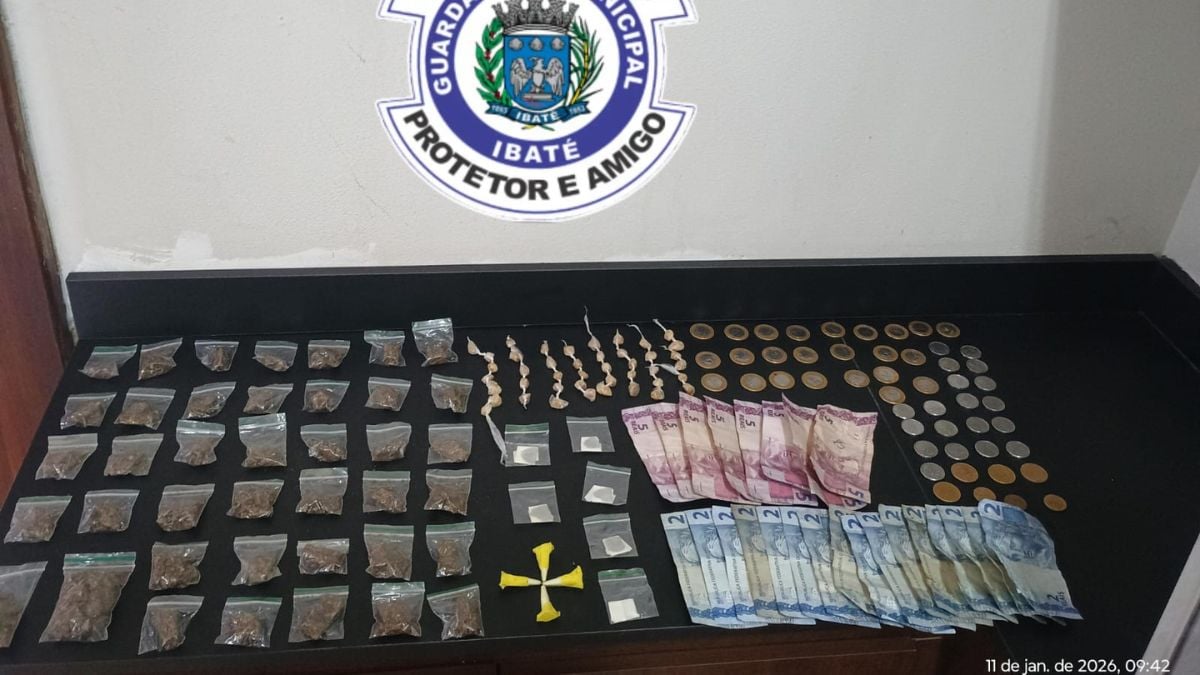 Em diligência pelas imediações, os GMs localizaram uma sacola branca escondida entre pneus, em frente a uma residência abandonada. No interior da sacola foram encontrados 43 pedras de crack, seis porções de ice, quatro pinos de cocaína, 40 porções de maconha, além de R$ 106,80 em dinheiro.