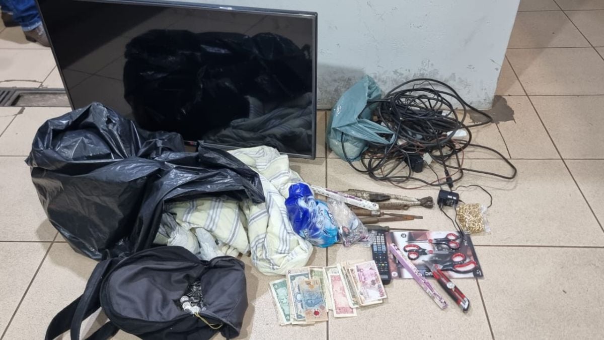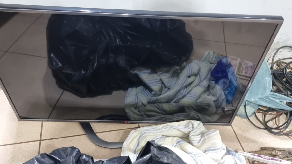 As equipes foram rapidamente ao local e realizaram a abordagem. Com os suspeitos, foram encontrados uma TV de 50’’, cédulas e moedas antigas, jogo de tesouras, extensões elétricas, além de ferramentas como alicate e torquês.