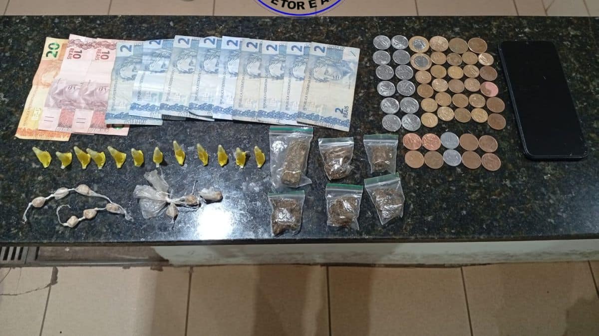 Material apreendido: 12 pinos com cocaína, 9 pedras de crack, 6 porções de maconha, 1 celular e R$ 70,50.