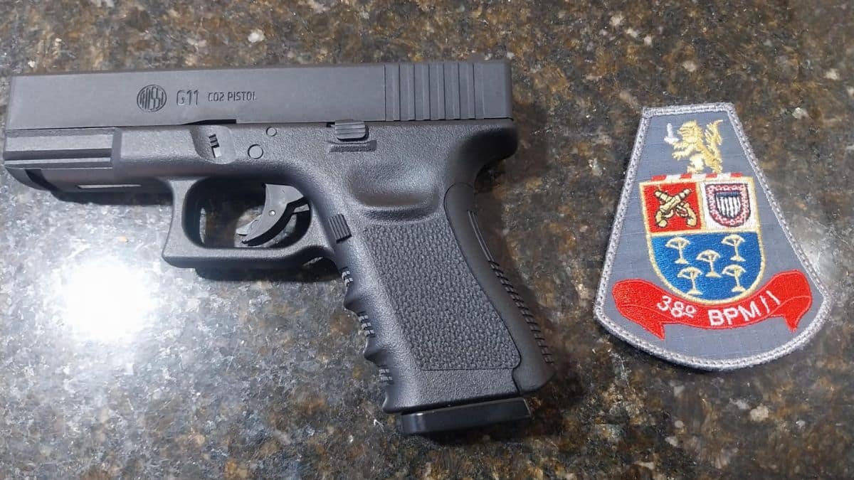 Com base na descrição fornecida, a equipe policial identificou o suspeito e realizou a abordagem imediata. Durante a revista, foi encontrado na cintura do homem um simulacro de arma de fogo na cor preta. Ao ser interrogado, ele afirmou que comprou o objeto para se proteger após uma discussão com outras pessoas.