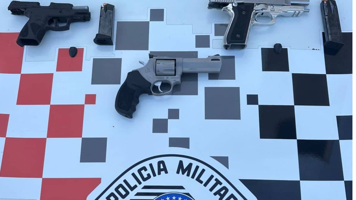 Na abordagem inicial, nada de ilícito foi encontrado com o suspeito. No entanto, uma busca na residência revelou uma pistola Taurus G2C calibre 9mm, carregada, sobre uma mureta na garagem. No quarto, dentro de um cofre, os policiais localizaram uma pistola Taurus PT92 cromada, calibre 9mm, e um revólver Taurus RT627, calibre .357, todas registradas em nome do acusado. Foram apreendidas ainda 21 munições calibre 9mm e 7 munições calibre .357, todas intactas.