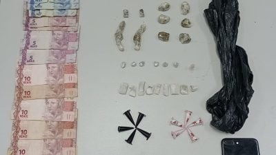 Ao todo, foram apreendidos 657 pinos de cocaína, 58 pedras de crack, 17 porções de maconha, uma máquina de cartão e R$ 20,15 em espécie.