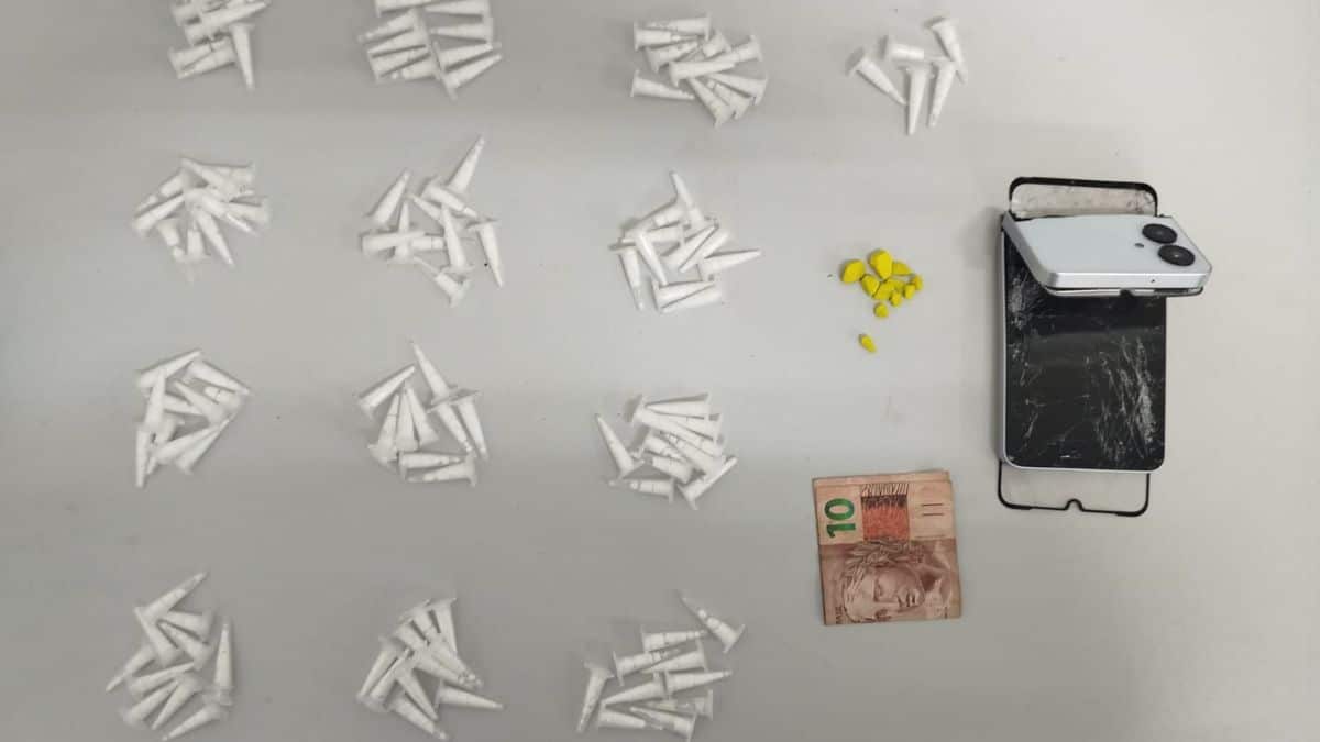 Durante patrulhamento preventivo, a equipe formada pelo Sgt PM Alef e Cb PM Adriano percebeu que o suspeito mudou de direção de forma brusca ao notar a viatura, demonstrando nervosismo e chegando a quebrar voluntariamente o próprio celular. Os policiais realizaram a abordagem e encontraram com ele 14 pinos de cocaína e R$ 10 em dinheiro fracionado.