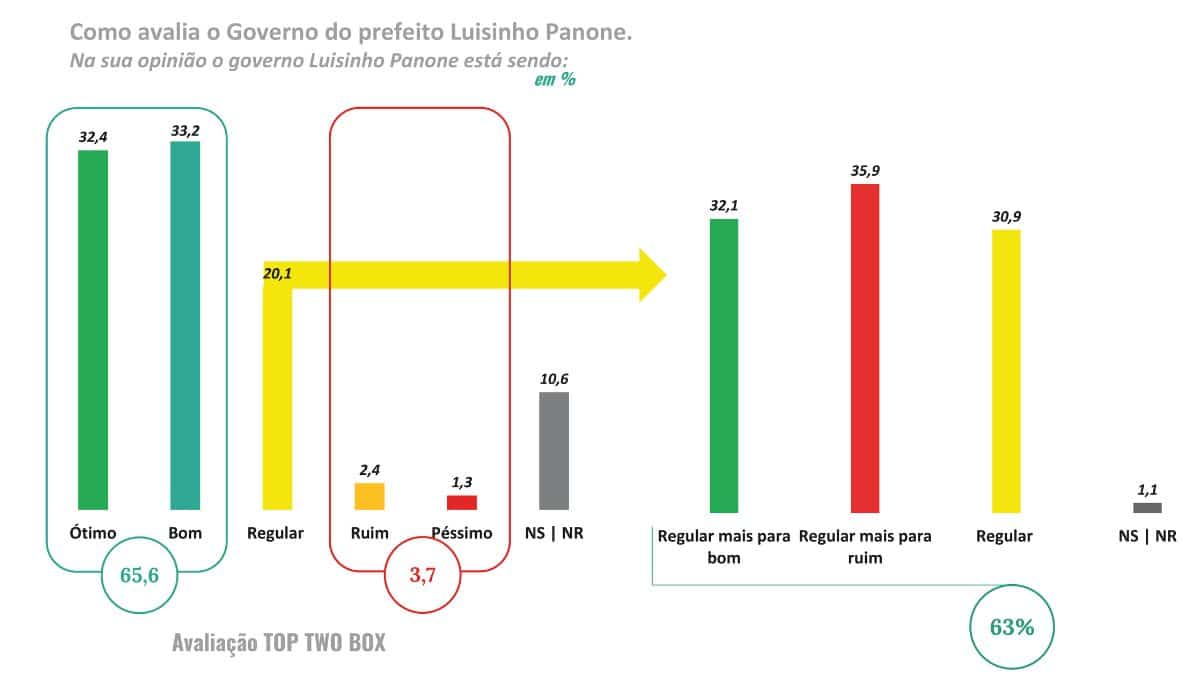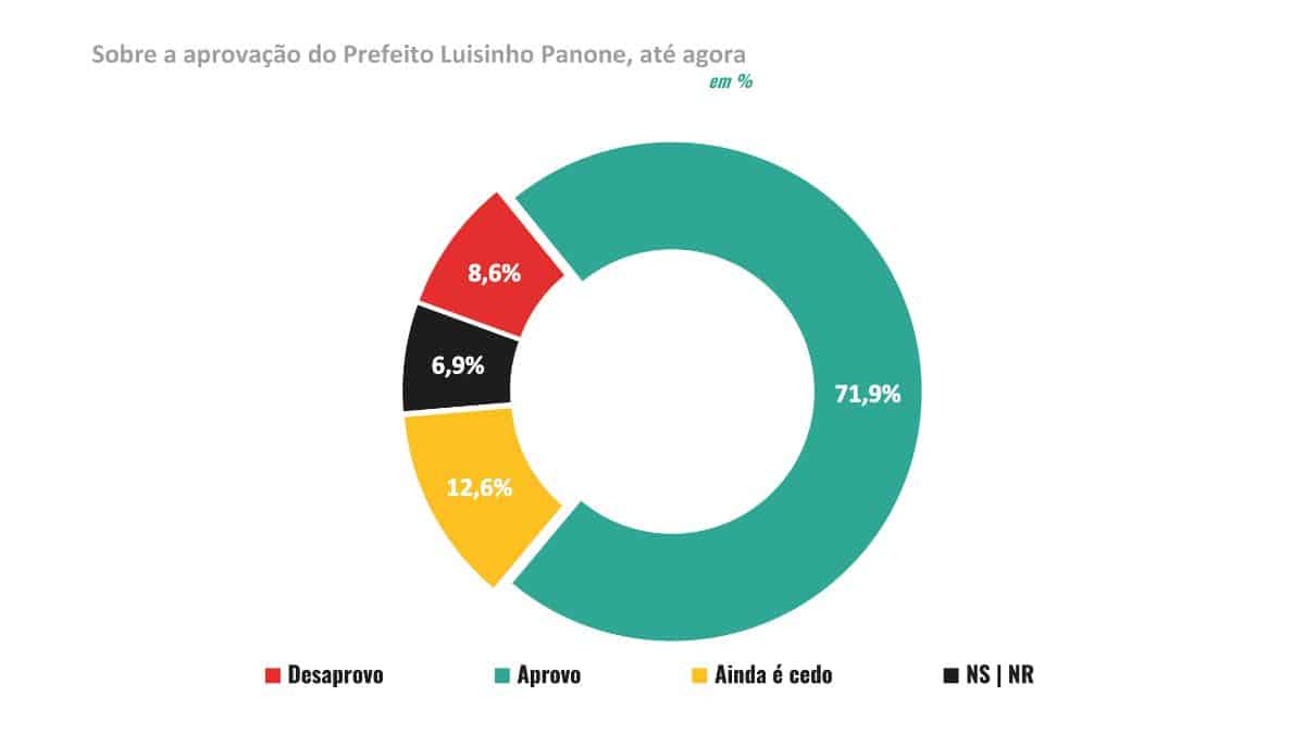 O prefeito de Descalvado, Luisinho Panone (PSD), possui ampla aprovação da população. Segundo o levantamento, 71,9% dos entrevistados aprovam a gestão municipal, enquanto apenas 8,6% disseram desaprovar. Outros 12,6% afirmaram que ainda é cedo para avaliar, e 6,9% não souberam responder.