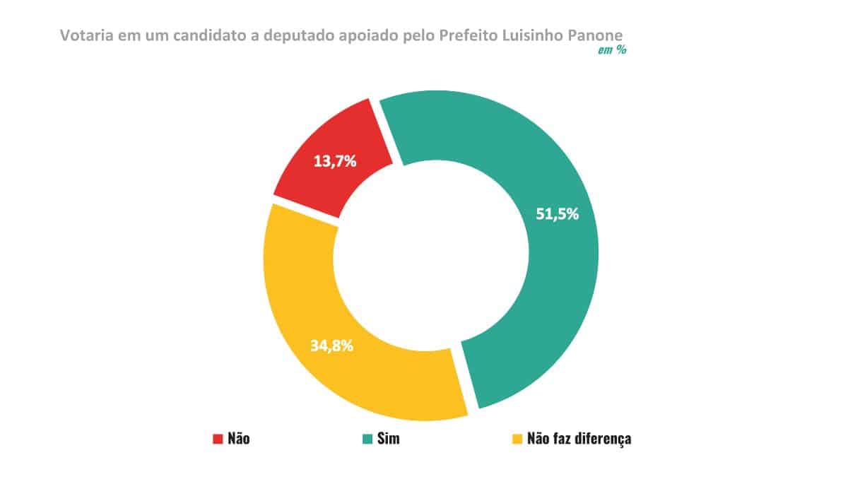 Outro dado que reforça a boa imagem de Luisinho é que mais da metade dos entrevistados, 51,5%, afirmaram que votariam em um candidato a deputado apoiado pelo prefeito, o que mostra a força política e o prestígio que ele mantém junto à população. Vale ressaltar que, em 2024, Luisinho foi eleito prefeito com 63,24% dos votos válidos.