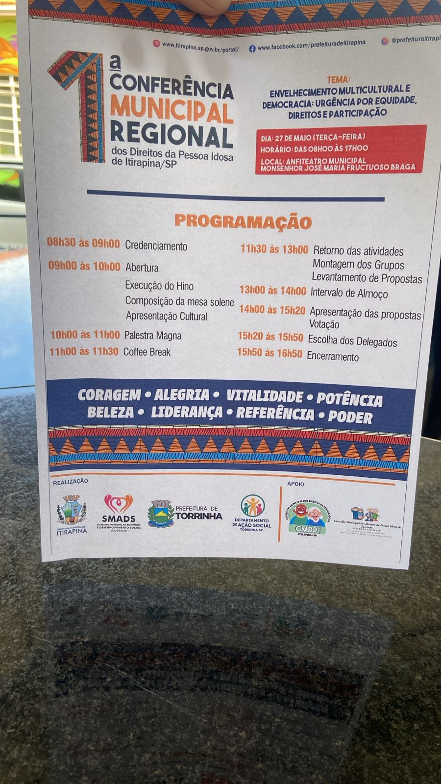 A Prefeitura Municipal de Itirapina, em conjunto com a Prefeitura de Torrinha, através da Secretaria Municipal de Assistência e Desenvolvimento Social de Itirapina (SMADS) e do Departamento de Ação Social de Torrinha, realiza nesta terça-feira, a 1ª Conferência Municipal Regional dos Direitos da Pessoa Idosa de Itirapina.