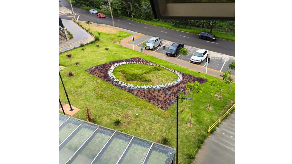 Nada de copiar projeto da internet: foi desenhado planta por planta, direto do conhecimento e da mão de quem entende. O paisagismo forma a bandeira de São Carlos, desenhada com plantas, cores e muita paciência.